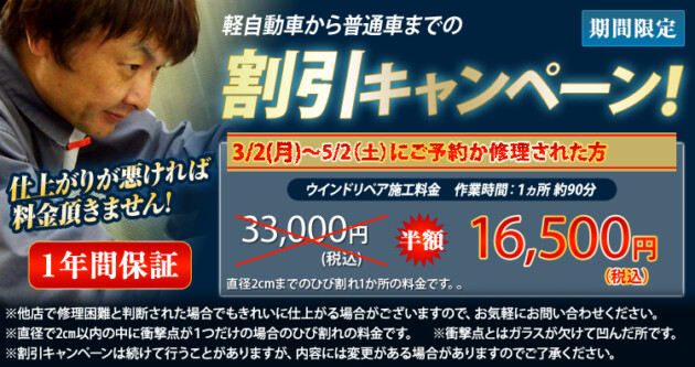 2. ウインドリペアで修理したヒビの保証は1年間です。修理した箇所のヒビの強度が1年間でなくなるわけではありません。修理後の経過に不具合等があった場合を含め修理した箇所のヒビが広がってしっまた場合は、お支払いいただいた修理代金を"全額返金"させていただきます。