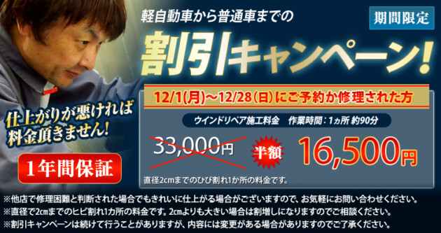 2. ウインドリペアで修理したヒビの保証は1年間です。修理した箇所のヒビの強度が1年間でなくなるわけではありません。修理後の経過に不具合等があった場合を含め修理した箇所のヒビが広がってしっまた場合は、お支払いいただいた修理代金を"全額返金"させていただきます。