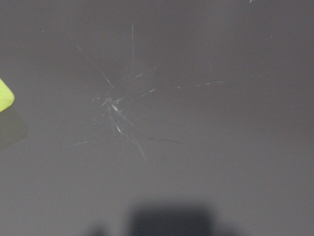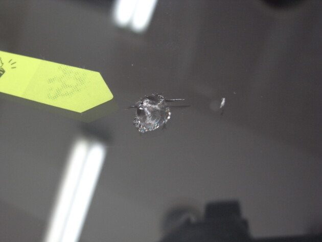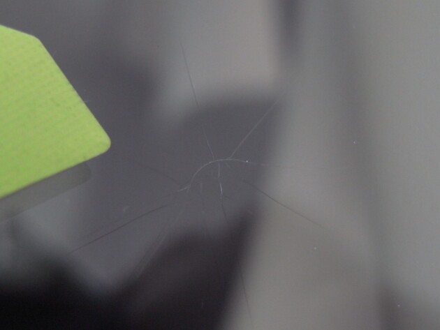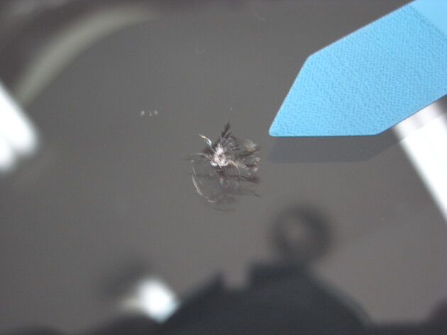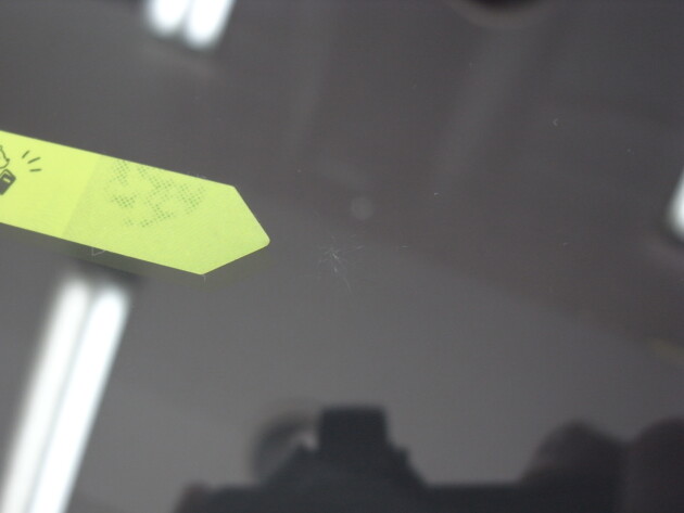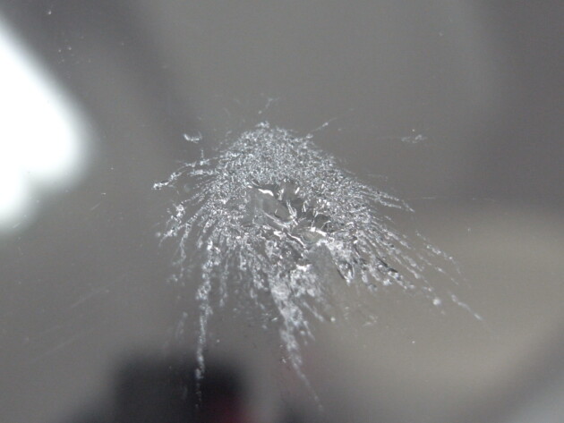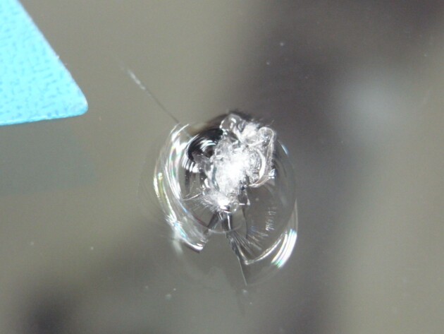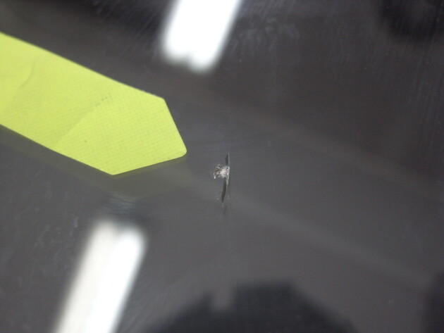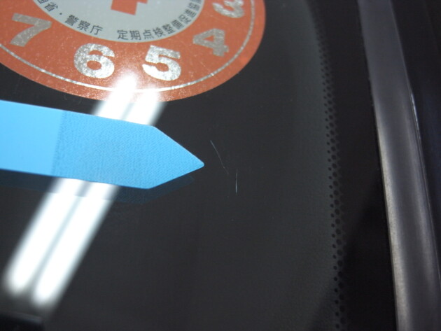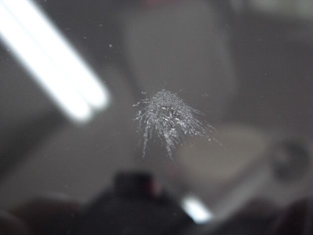 今回は、フロントガラスの運転席側に1cm位の傷とのことでご来店されましたが、見てみますとひび割れなどではなくガラスの表面が溶けたような直径1cm位の傷でした。