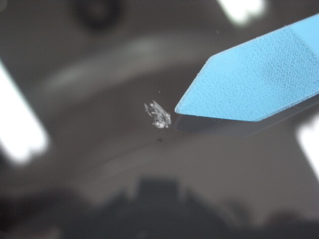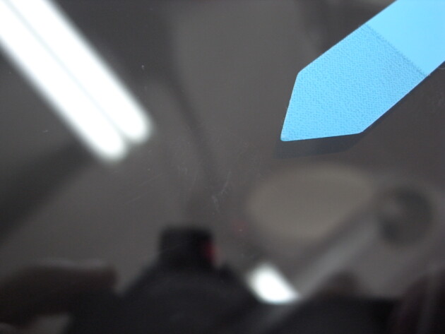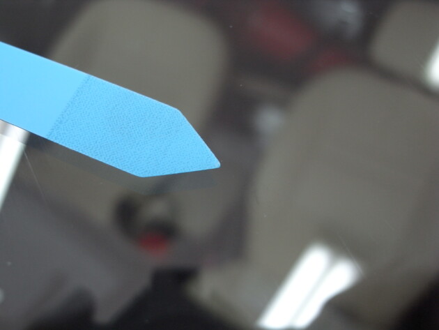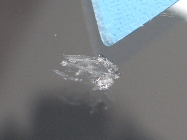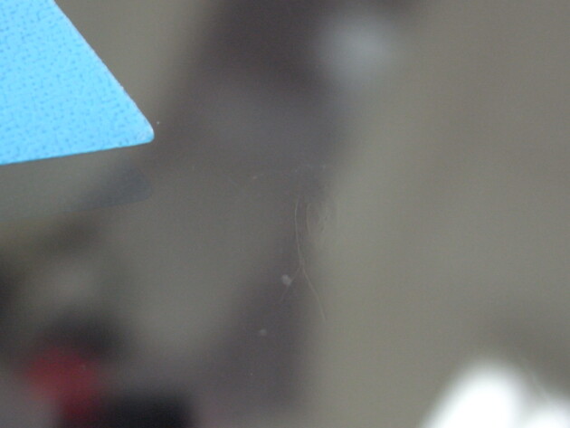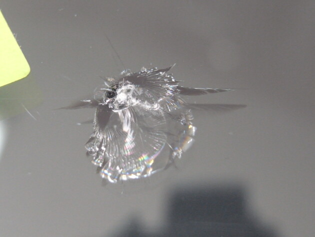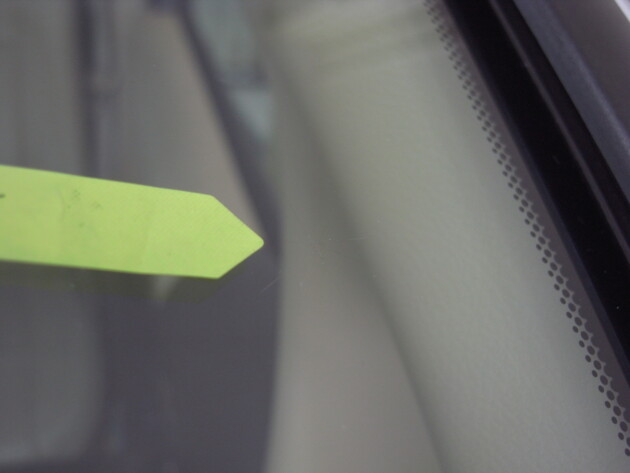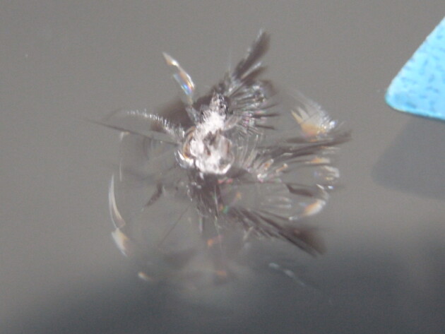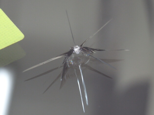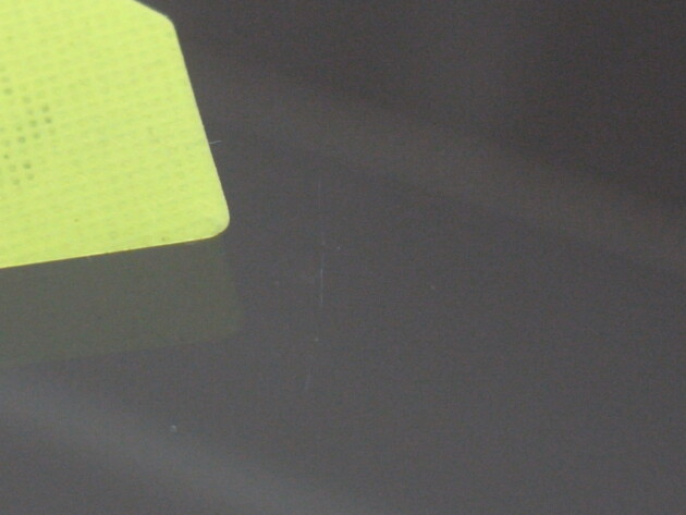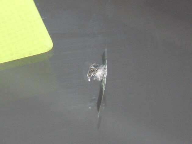 今回は、フロントガラスの運転席側に1cm位の傷とのことでご来店されましたが、見てみますとひび割れなどではなくガラスの表面が溶けたような直径1cm位の傷でした。