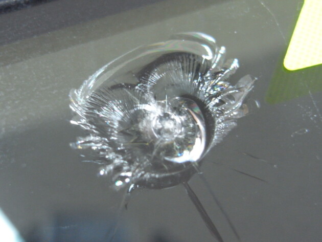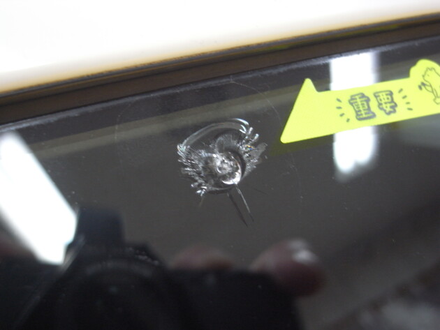 今月の初めに飛び石の修理をさせていただいたお客様、修理をした翌々日にまた飛び石でひび割れです。