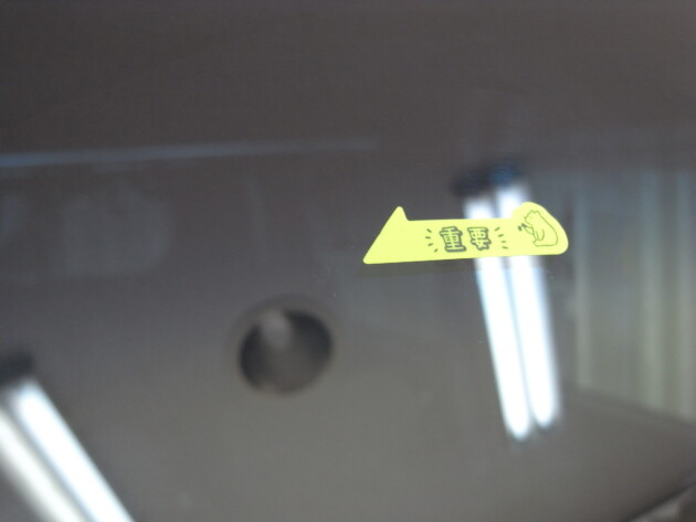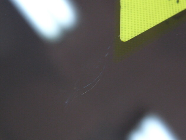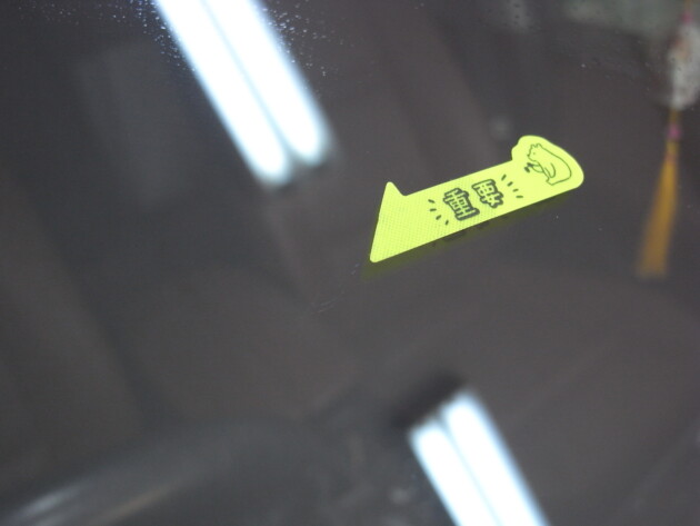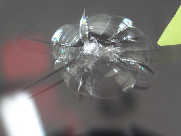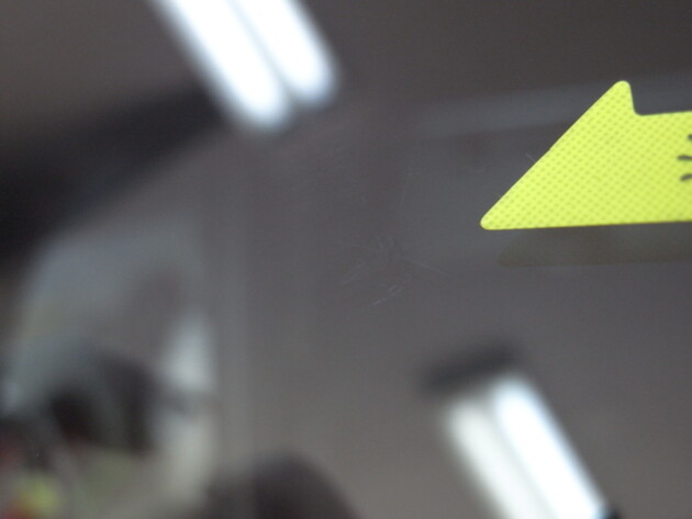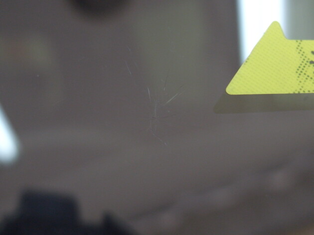 運転席の上側のトップシェードの所に飛び石ひび割れです。