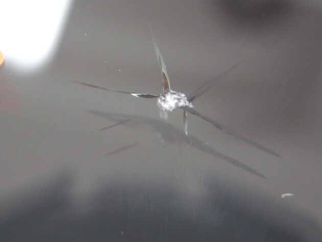 大きな石が飛んできて2つのひび割れがくっついたひび割れです。