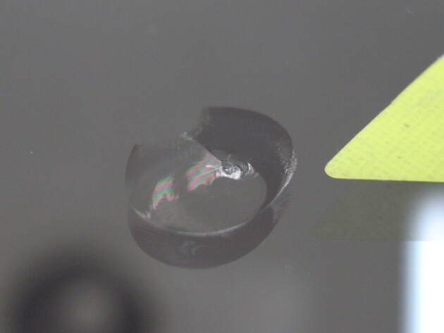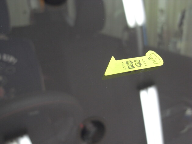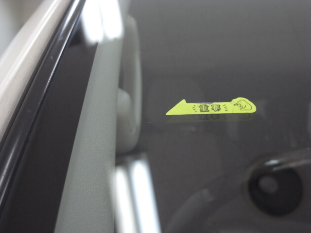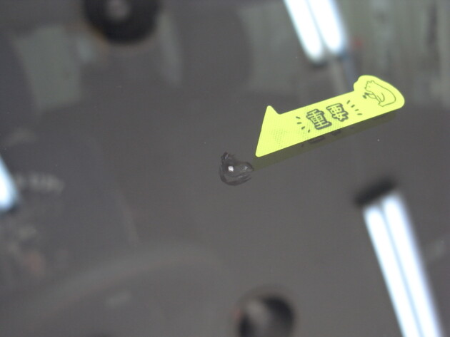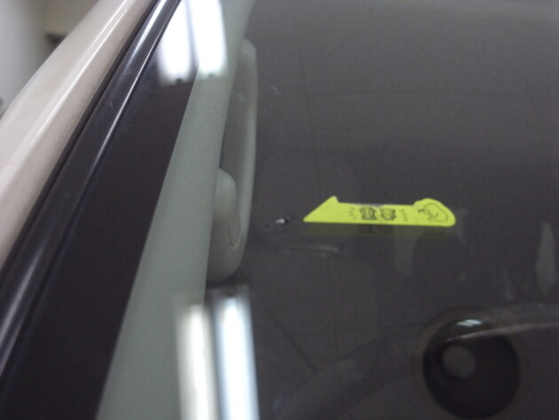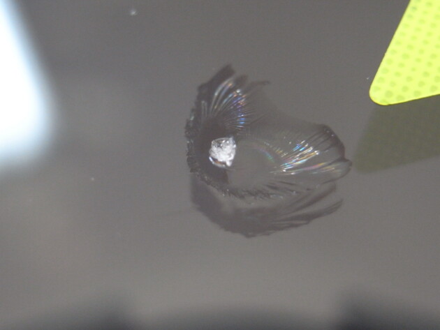フロントガラスの下側の黒いセラミックのドット部分に直径2.5cmのひび割れです。