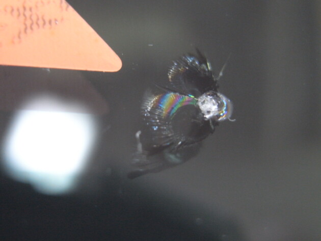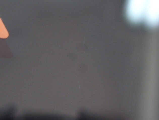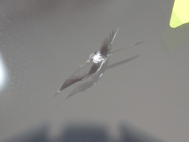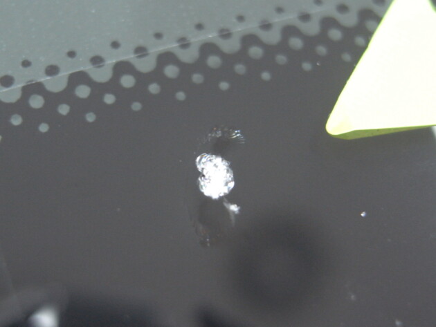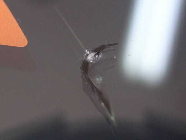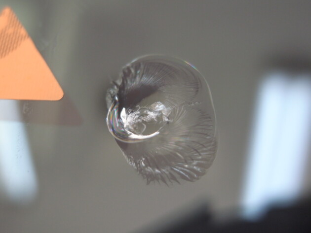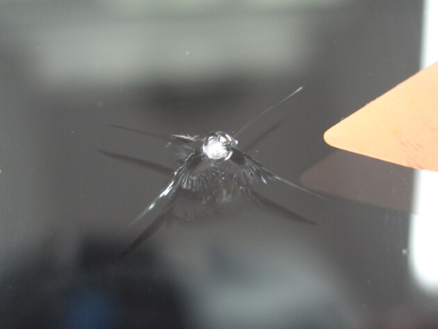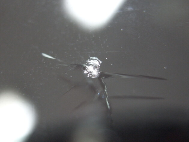 直径1.4cmの衝撃点が3つあるひび割れです。
