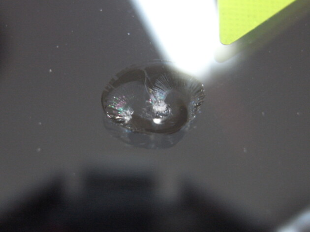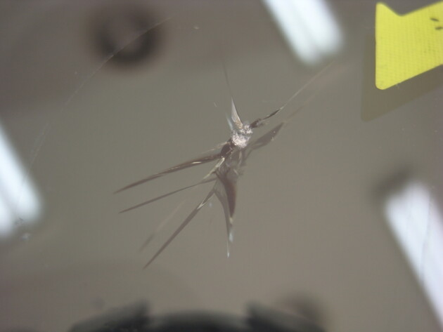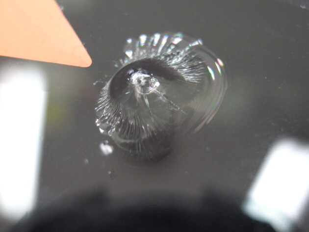 衝撃点が2つのひび割れになっています。