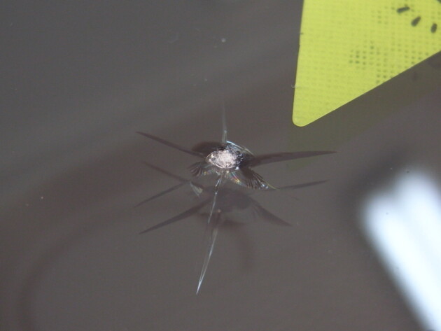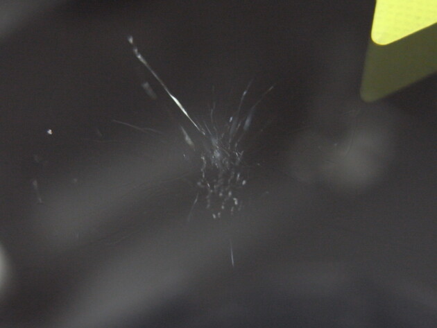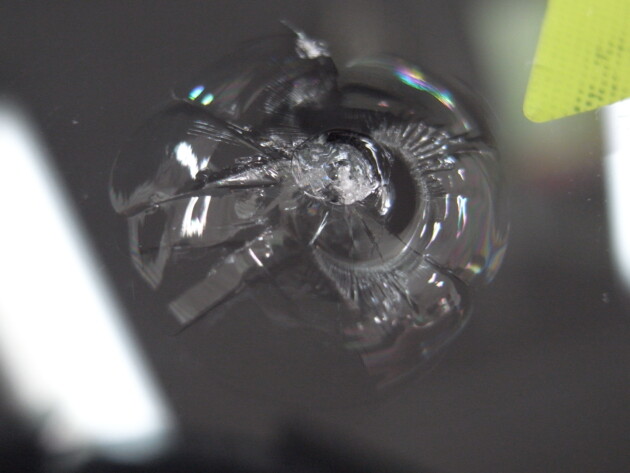 一般道でバスの後ろを走っていたところ前方のバスが車庫に入るために左側に曲がった瞬間にバチンと音がしたので見てみるとヒビが出来ていたそうです。